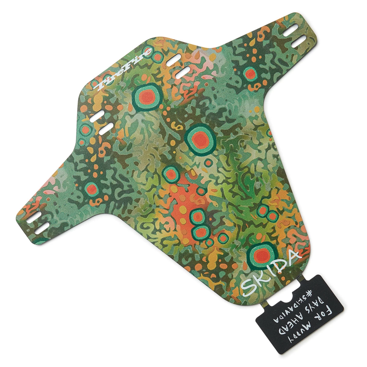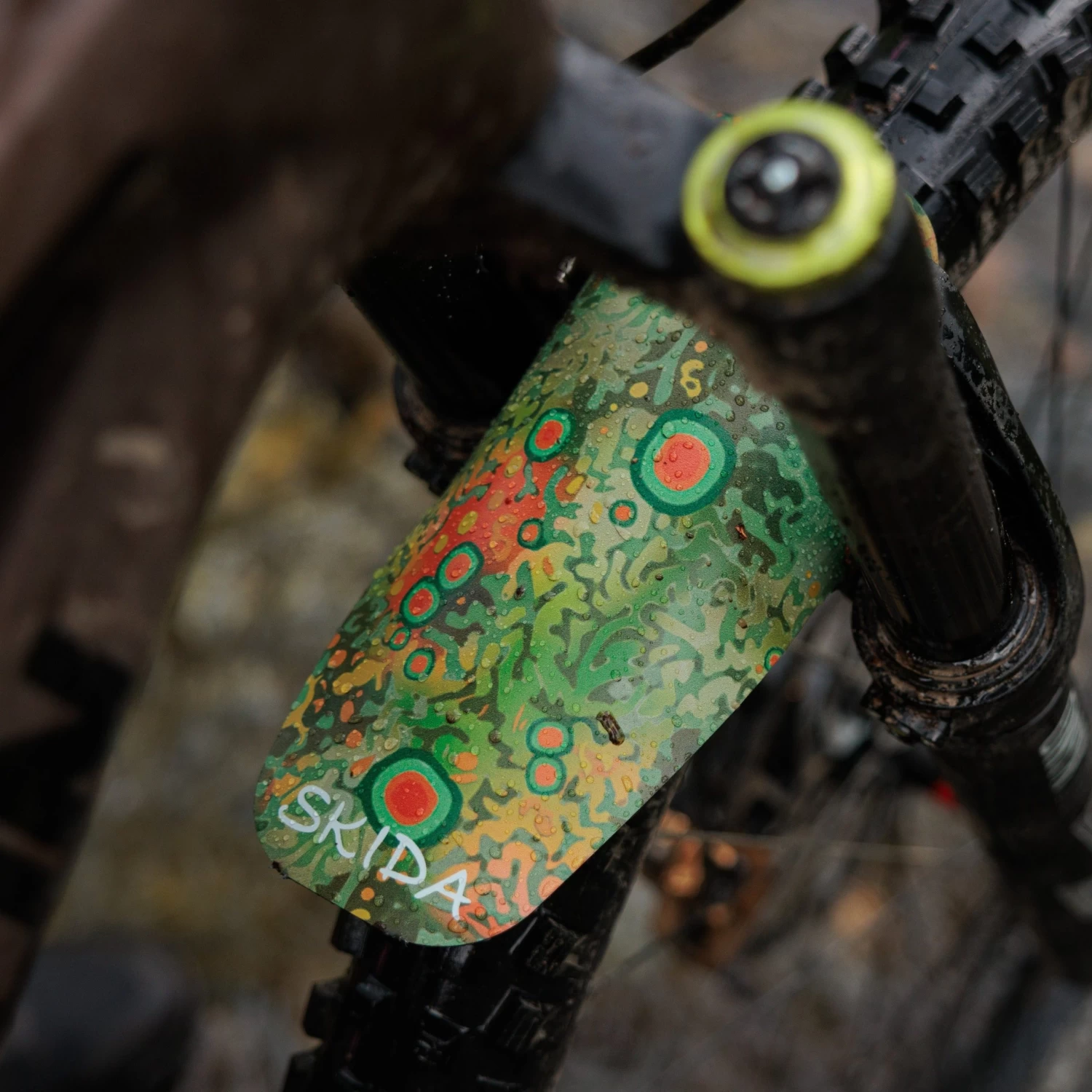 Curve the fender underneath the crown of your bike to get placement. Loop two zip ties through the top two fender slots and place around the fork crown. Then loop two ties through the outside slots of the fender and around your fork lowers. Pull zip-ties tight and get pedaling!